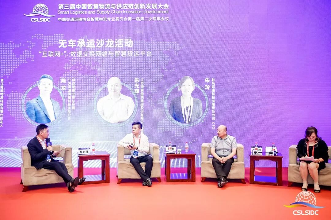 大会期间江苏零浩网络科技有限公司供应链事业部总经理陈龙、江苏物润船联网络股份有限公司董事长朱光辉、村鸟网络科技有限责任公司CTO朱玲围绕互联网+数据交换网络与智慧货运平台进行了无车承运沙龙活动,浙江易辰物流科技有限公司CEO易兴江主持活动。
